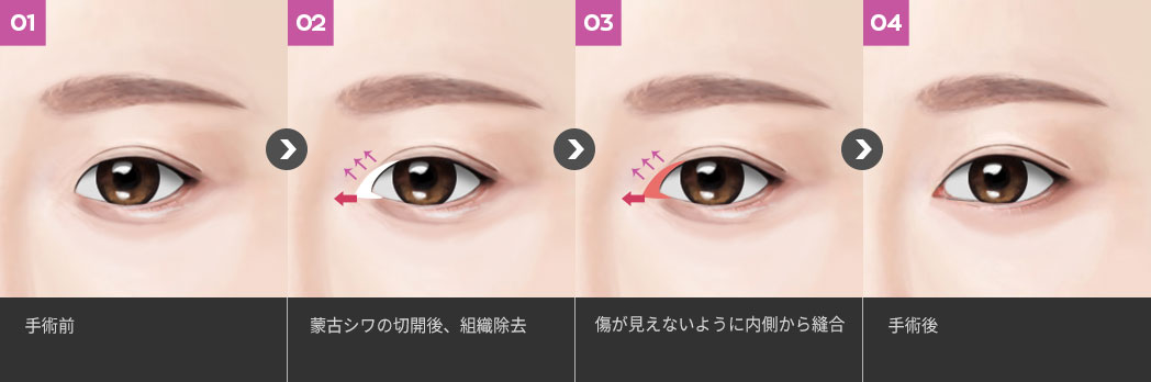 な大きさを伸ばします。過度に覆われている外眼角(目の後ろの部分)の皮膚と粘膜を切除し縫合させ、横の長さを伸ばし、目元をはっきりと深い目にします。
